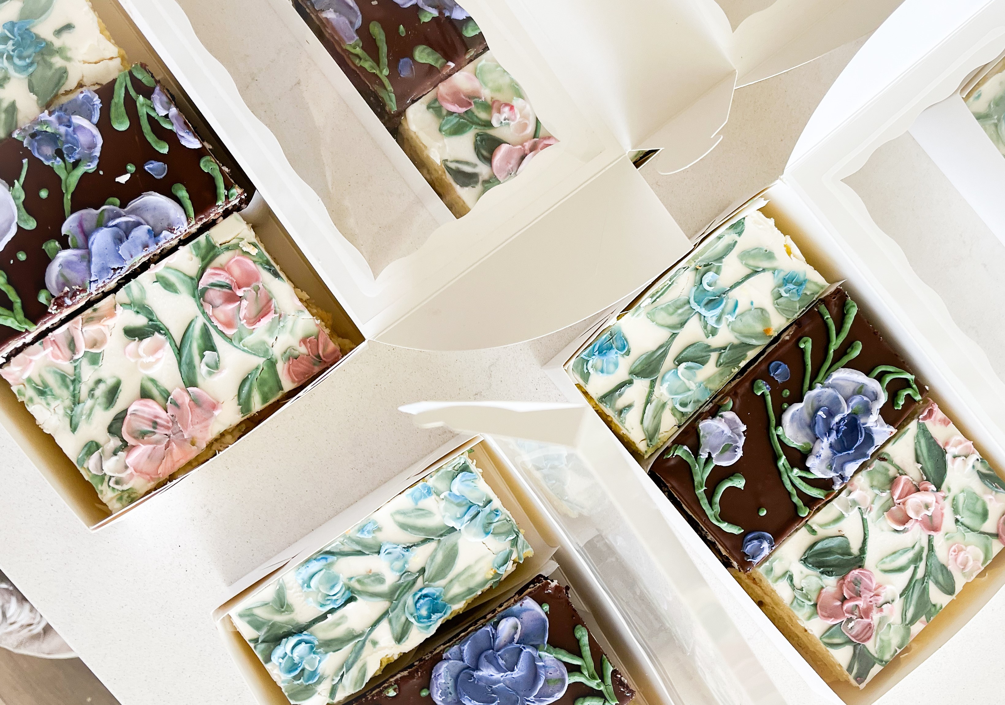 I created cake sampler boxes with three different flavors, each slice decorated with a different buttercream flower design.
